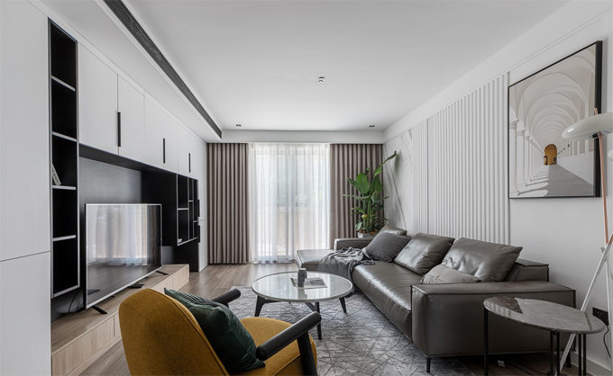 这个装修案例,因为房屋是一楼,所以自带一个院子。我们把原户型客厅的进门封掉,让电视背景更长更立体,客厅的南边窗户完全打开变成新的入户门;儿童房旁边的过道打开,归儿童房,做了一个休闲的地台;北边的阳台也是完全打开的,一部分分给了西厨吧台一部分归纳带厨房,卧室的阳台归纳到南主卧,这样一来整个室内的布局通过过道的增加让每个空间变得更大,家里的布局和动线也更加舒适。