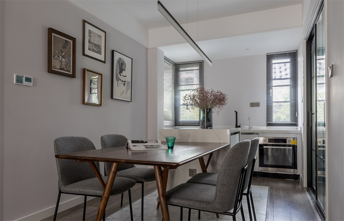 餐厅往客厅方向,整个画面是由黑白灰组成,橘色的边椅作为调色提升空间色现有餐厅格局也是做了调整的,把原来北边的阳台敲掉归纳到餐厅,做了一排靠窗的吧台加一个水槽。平时女主人在厨房做饭,男主人可以在外面接水泡茶或者洗洗水果,互不冲突。整个餐厅就由餐桌,岛台,吧台构成!西厨:台面可以放置面包机,咖啡机,烧水壶等