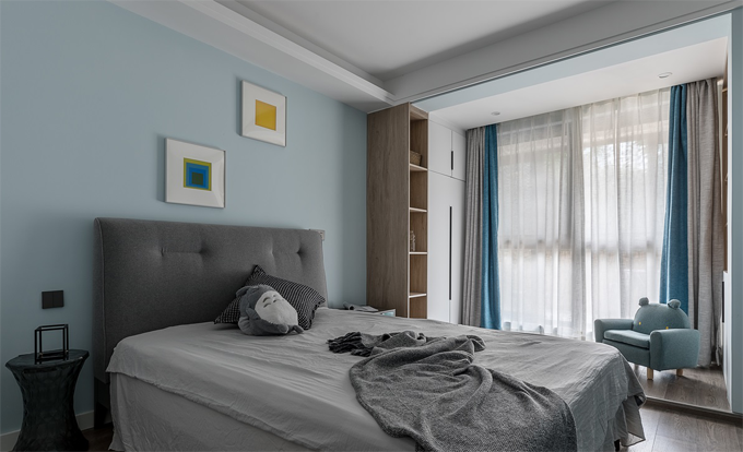 由于改造过后家里的户型变成南北通透,不管是光线,动线,气流都变得更加有优势。儿童房的地台部分也是属于拓出去的地方,儿童房的空间变大,光线也更舒服,空间是由浅蓝色组成,不会显得很幼稚。地台的功能是属于区域的划分,将休息和休闲区利用地台划分开来,小朋友可以在上面看书玩游戏。