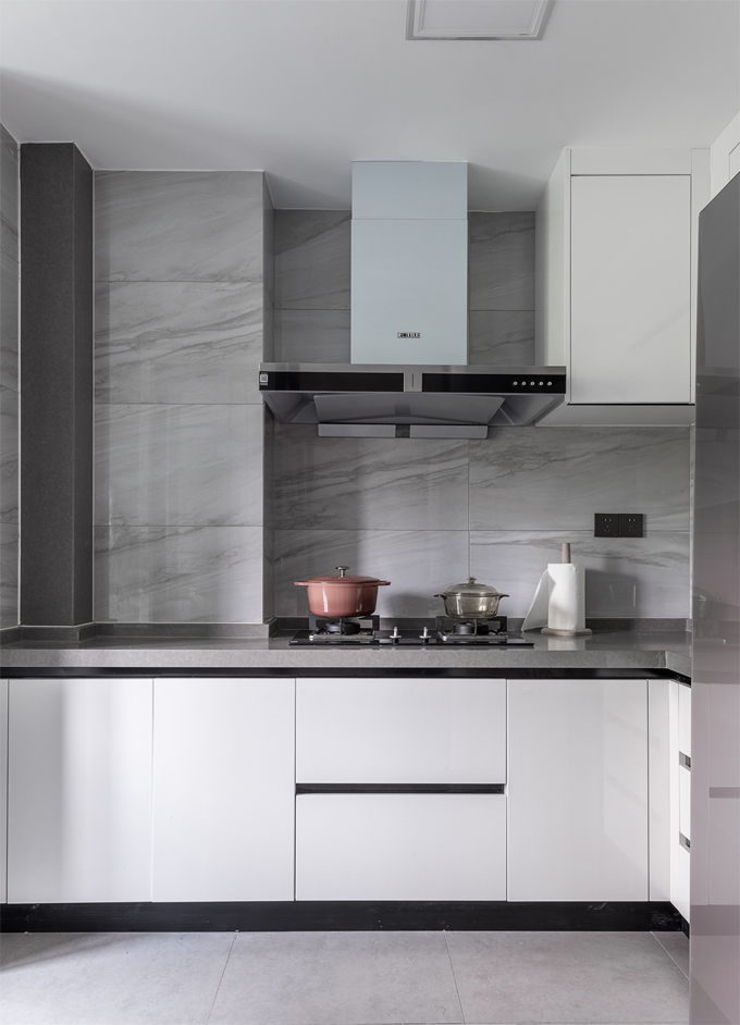 厨房的空间在原始的户型上做了延伸,把原来的北阳台归纳到厨房,厨房的空间和收纳变得更大。