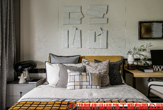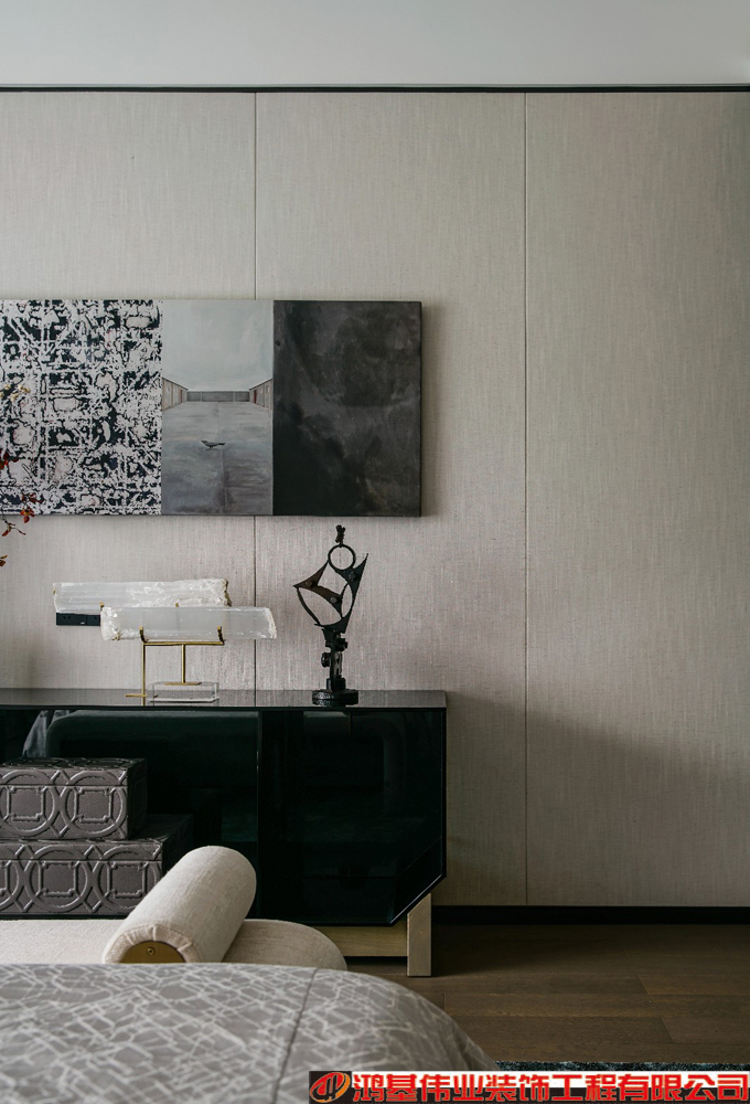 长辈房延续客餐厅的整体调性,多采用哑光饰面和手工质感的肌理,细腻的浅灰色皮质,胭脂红圆形艺术品,呼应材质本身的层次与质感去传达空间的气韵。