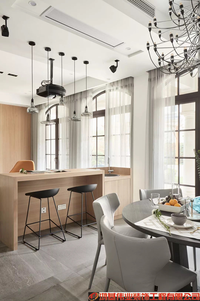 。餐厅和客厅之间做了一个吧台,既可以补充客厅的座位,又可以分割两个空间。吧台留出直饮水水槽,方便日常使用。错落的吊灯增添线条感木色橱柜搭配小白砖,清新简约。。