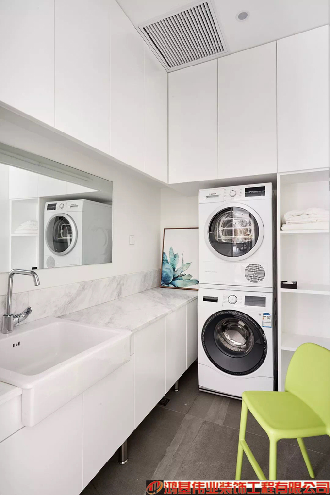 针对客户的实际需求,一楼卫生间的干区兼做洗衣房。洗衣机与烘干机搭配使用,台盆也采用了可以足够洗衣服的大尺寸。