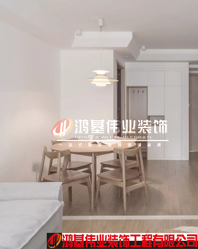 整个客餐厅的空间整体以原木色和白色搭配,原木色质感温润,搭配干净的白色,舒适且自然。餐厅用了原木色四人桌,极具设计感的吊灯是业主费尽周折从日本代购回来的。