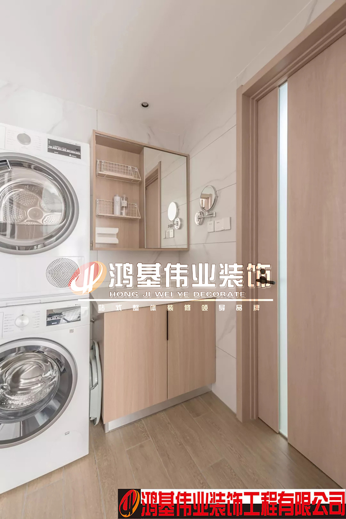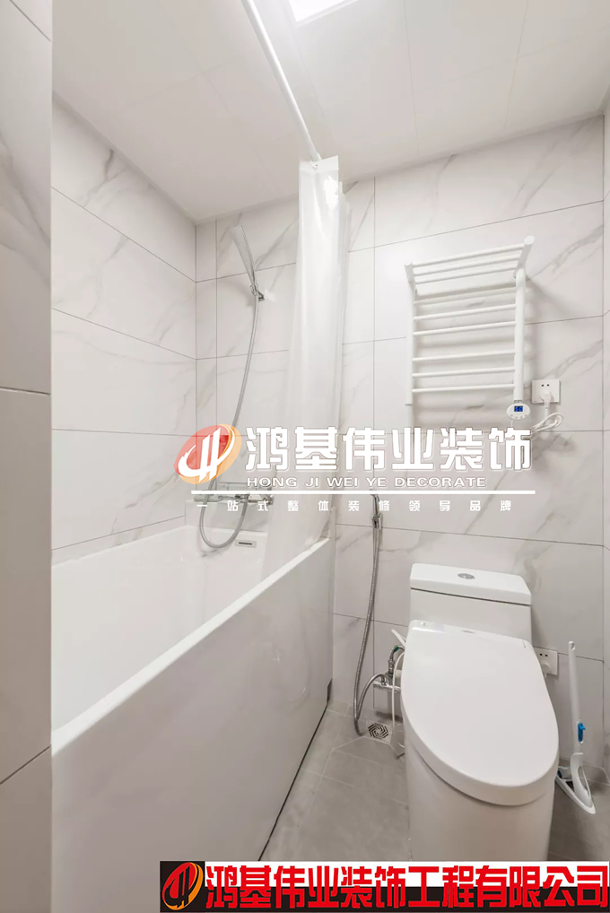 卫生间做了干湿分离的设计,将洗衣机和烘干机放到这里,可以左右推拉的镜柜解决了干区储物功能的问题。湿区部分的全白色设计,干净整洁,再小空间也要有一个浴缸,这是业主的一个执念。