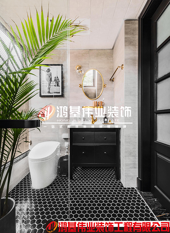 主卧蓝绿色背景墙,金属小饰品、深蓝色的床单、脏粉色小抱枕、几何图案的小盖毯,色彩浓重鲜明、复古又现代;主卫的地面用了黑色马赛克砖,房门与洗脸台也告别了外卫的小清新,延续了更衣室柜门的黑色,配色金属色的圆镜与壁灯,营造出复古又轻奢的高级质感。