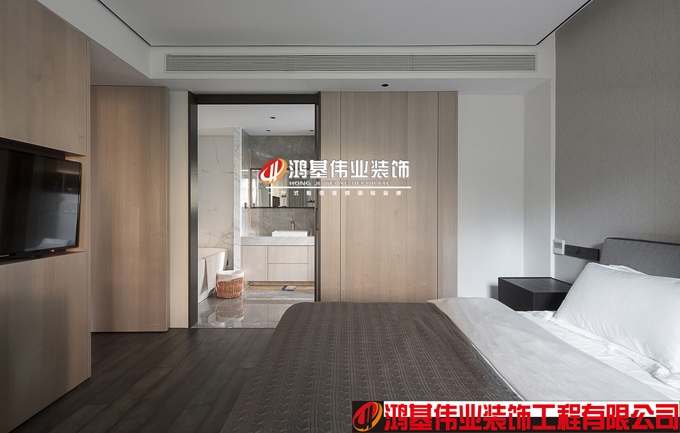 穿过过廊,主卧在房子的东侧,色调柔和,质地讲究,
