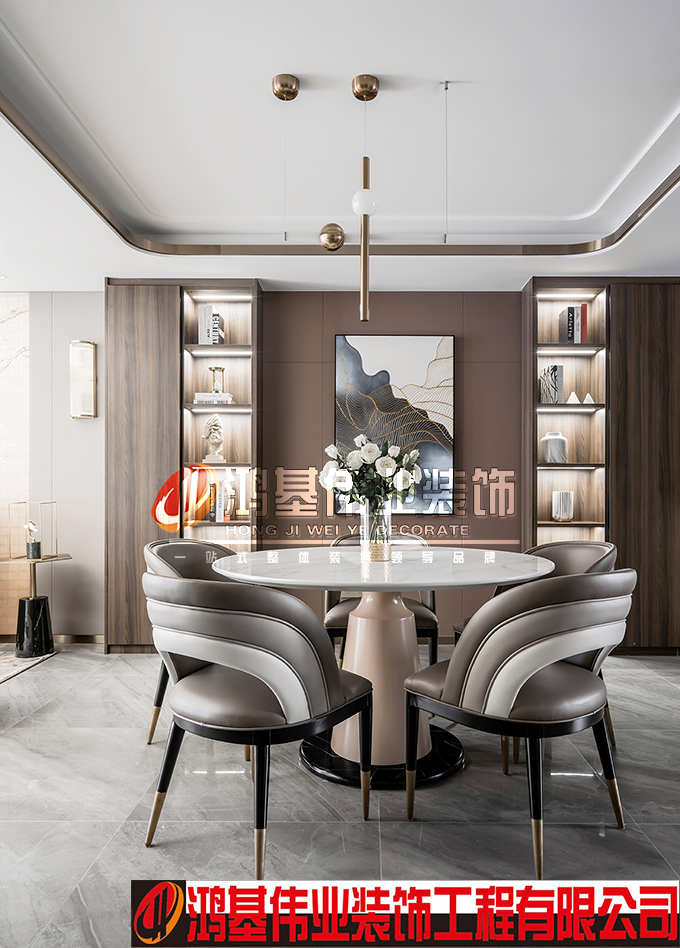 背景以对称的开放柜 和大块面的木饰面结合的方式来增加餐厅区域的仪式感圆桌让环绕动线更为流畅舒适。