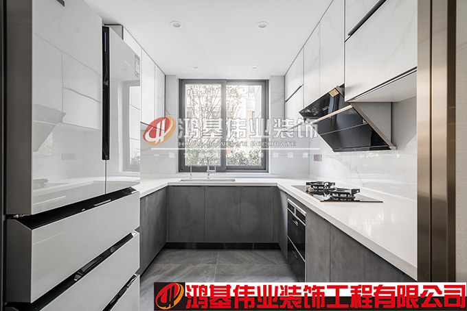 极简黑白灰加以金色元素极大提升了餐厨区域的现代感无下轨的磨砂玻璃移门,见光不见景在空间完全贯通的基础上很好的区隔了厨房与餐厅空间。