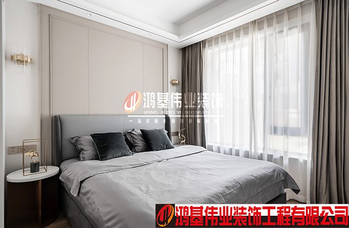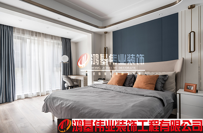 主卧空间在延续整体简洁、明亮的设计基础上增加了一些色彩搭配深湖蓝色的背景墙配以灰色的窗帘浪漫而不失庄重。