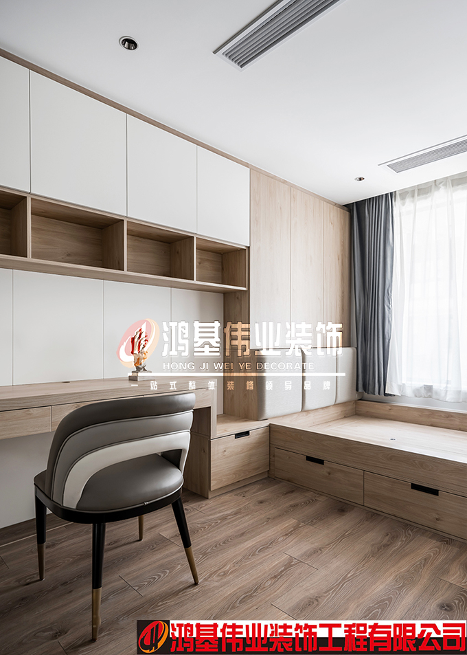 榻榻米结合书柜、书桌的定制形式让书房有限的空间最大化被利用并兼具了客房功能原木风格清新、自然、质朴提升了空间的暖度。