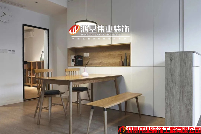 餐厅周围是定制的储物柜,其中一些格子是用木饰面装饰的,与周围的设计相呼应,在不用餐的时候这里俨然就是一间书房。有孩子的家庭就是各种收纳,这里摒弃了传统客厅电视墙的打造,做了整墙的白色收纳柜,让储物与墙面收纳完美融为一体。