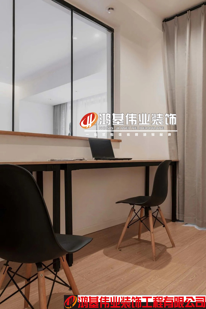 书房作为连接两个部分的枢纽,颜值相当重要,这里的玻璃隔断也会作为客厅背景。但因为书房与客厅相通,所以在色调上书房用了安静的浅灰色,希望用视觉的不同将两个空间进行区分。