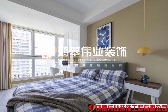次卧结合了卧室+书桌+收纳的功能,全方面满足屋主孩子的生活与学习,米黄色的主色调与床头小巧的灯相映照,让空间更加的个性化。