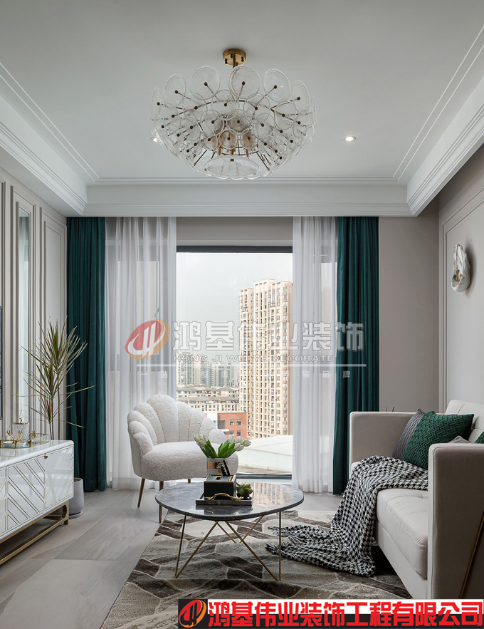 客厅精致的细节中透露出一丝浪漫的复古情调,落地窗使光线贯穿着整个空间,看出去的视野开阔通透。
