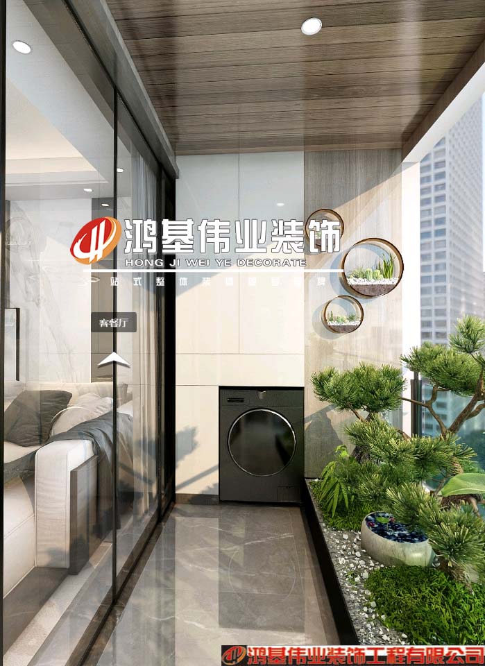 阳台西侧滚筒洗衣机和储物柜的结合设计,充分利用空间。卫生打扫更加方便,不留死角。 东侧留有更多的空间可以培养绿植及休闲,给阳台空间增添生机。