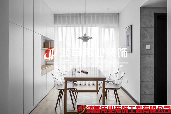 原次卧室改变为餐厅空间,扩大了房屋公共空间面积,增加了采光通风,餐厅与厨房形成“对望”格局,加以简洁又不同颜色与 材质相互穿透的餐边柜和餐桌,完美呈现出实用功能与美感并存的无限可能;