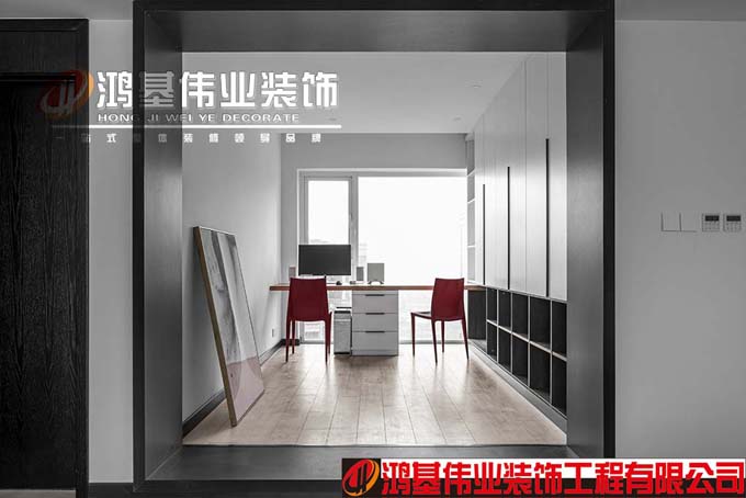书房以整体定制的书柜、书桌构成体量化的块体,克制的材料的用,以体现“HOME BACK HOME”的精髓。柜体下方的隔板柜设 计,便于灵活储物,减少了整面柜的沉闷感。