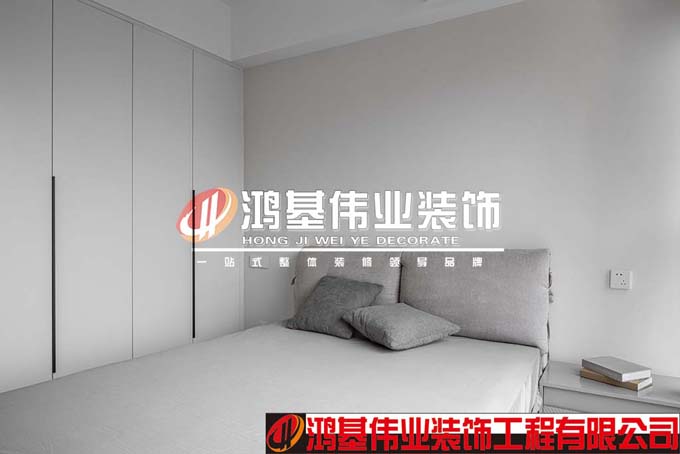 次卧以素雅高级的灰色、纯净且不同肌理材质的白,和谐简要的回归居室原本的宁静感。