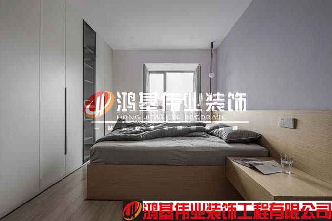 主卧现场工人制作的床头背景、床头柜、床架都饰以自然温和的木饰面与木地板的通铺方向形成的视觉扩容感;床下采用箱体式 设计增加储物,奶白色衣柜与冰川灰背景色以及所有言语和情绪加筑成此处空间的包覆性, 现场木工制作的床头柜的与床靠背连成一体,最后以科定板饰面 。
