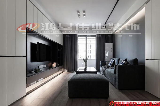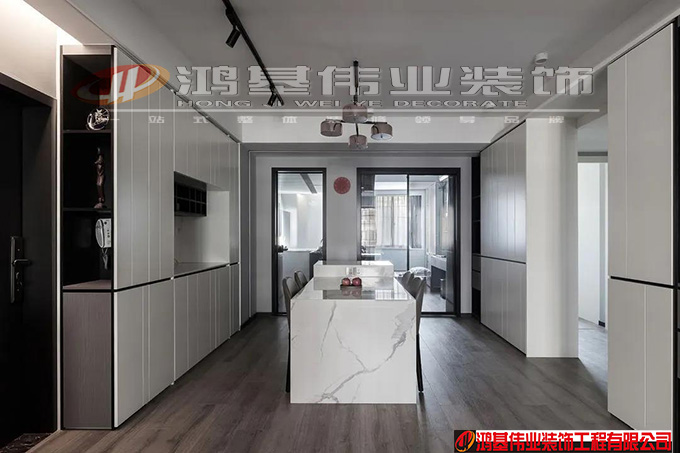 家里的储物空间永远嫌不够。女主人有许多的衣服、包包和鞋子。夫妻俩多年生活的点点滴滴也需要细细珍藏。住宅既凸显了风格,也顾及了实用技能。储物、收纳面积超过房屋面积,装得下屋主生活的一切美好。 考虑到空间的收纳性,电视背景墙设计成整面大柜,将电视内嵌,和玄关柜形成一体,视觉上简洁大气,实际实用方便。原来厨房墙体拆除后,整体视觉开阔,感觉连空间都大了许多!客厅原层高只有2.7米,为了不影响层高,直接把梁位露出来,在中间做了明装筒灯的设计及轨道射灯设计,当作一个造型,共存在空间里。