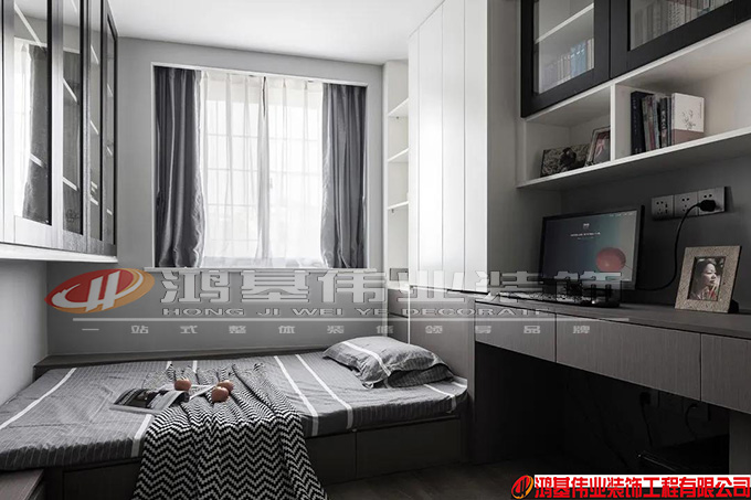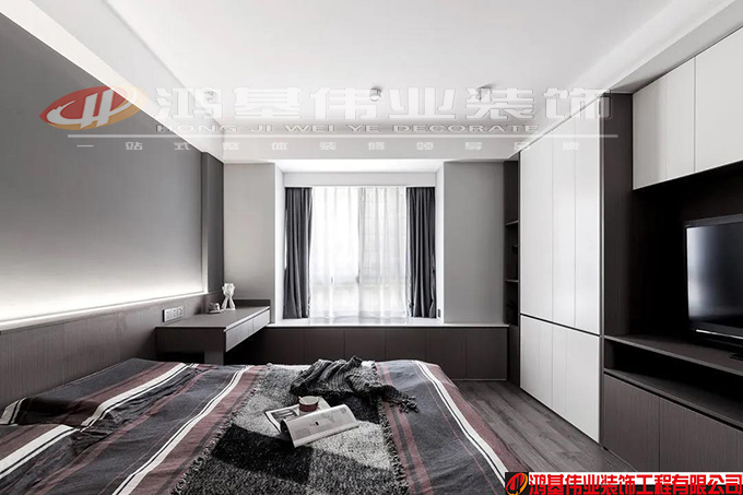 床正前方一排的衣柜大大增加了卧室的储物量,背景窗台也是做成飘窗柜增加储物量,与梳妆台一体设计。卧室的色调以灰色,木色配烤漆白色来搭配。