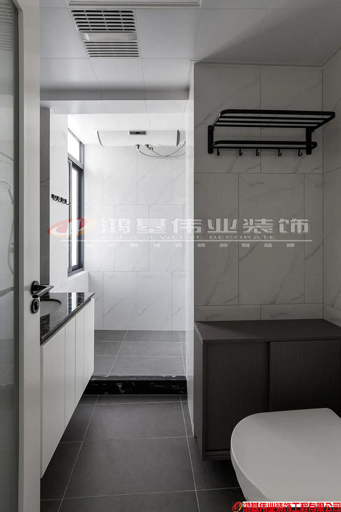 黑色大理石盆面 和 白色 墙砖搭配简约耐看 马桶旁加一组斗柜 增加卫生间的储物空间