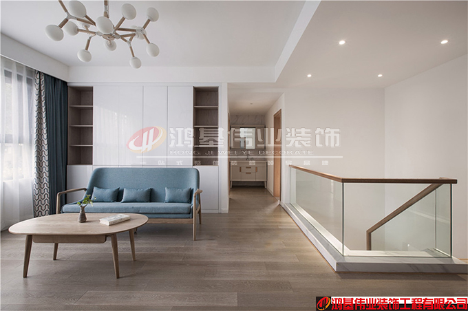 楼上的起居室,色调与整体家居风格一致,简约而不失趣味性。利用墙体定制柜增加收纳,中心区域通过小桌几,一字型沙发,组合成多功能娱乐区域,营造一个舒适愉悦、丰富多彩的起居空间。