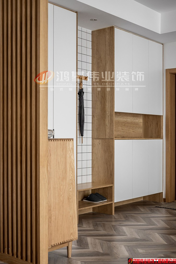 独立的玄关增加了充足的鞋柜与收纳柜,从中又增加了一处壁龛用作放置雨伞、衣物,以及老人小孩换鞋之处。