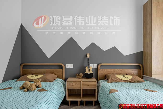 延续日式的整体风格,简洁的两张小木床看起来分外贴近大自然。分色墙的山峰造型设计让房间加入了活力的灵动感,仿佛置身在小小的森林当中。