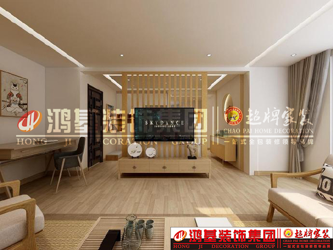 图三:原木色的电视柜搭配木质栅格,使整个空间通透,又合理。左边是一个书桌满足业主居家办公。