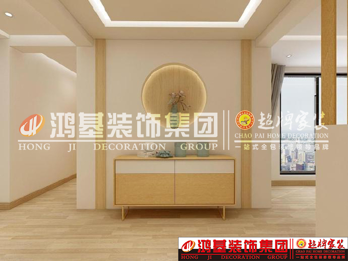 图四:这是一个玄关区域,矮柜搭配圆形的壁龛,里面做一个原木色的护墙板,使进门更有禅味,顶面回子形的灯带,简洁又雅致。