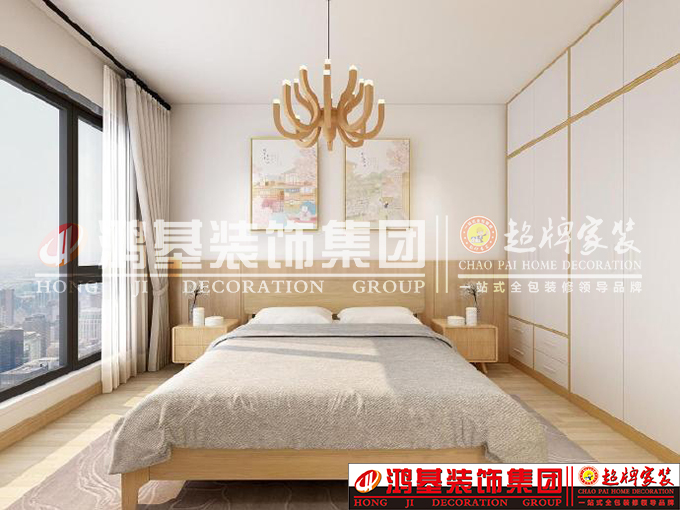 图五:是主卧,原木色的衣柜搭配白色的柜门,整体自然,又干净,大大的落地窗,自然采光极好。