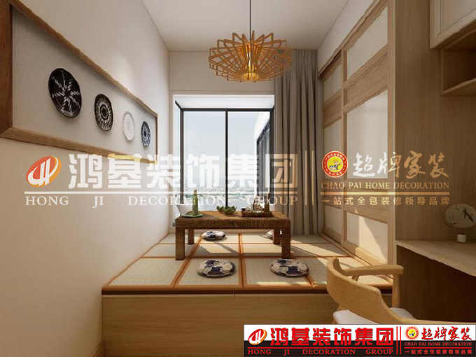 图六:是一个次卧做了一个榻榻米,既满足了收纳又满足了住人的需求,胡桃木色的桌几搭配碎花的坐垫满足业主朋友打牌的需求。