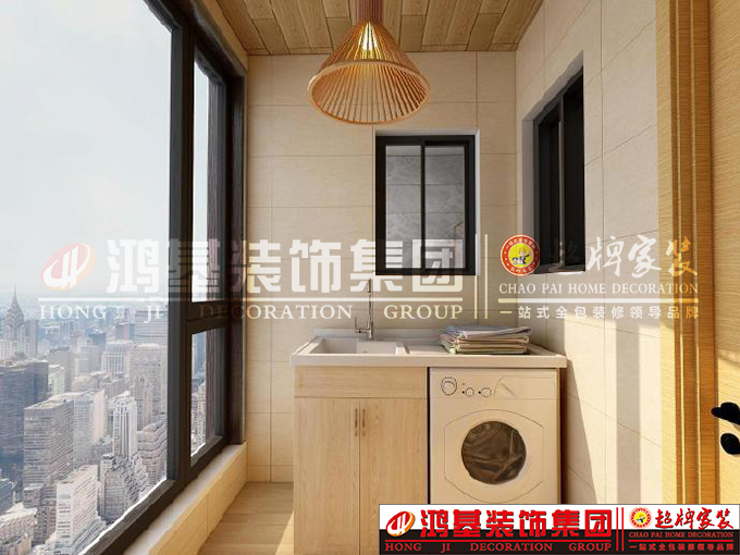 图七:是阳台区域,做了一个洗衣池,洗衣池下面是一个收纳区域,方便收纳一些洗衣用品,右边是滚筒式洗衣机,上面的台面可以放一些未洗衣物。