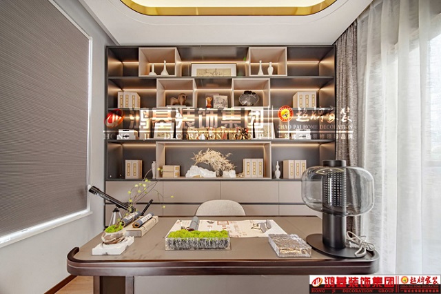 图4.亮点:书房从陈列到布局,从色调到材质,都表现出雅致的特征,窗帘选用通透感强的浅色纱帘既能遮光又能让将阳光折射变得温婉柔和。