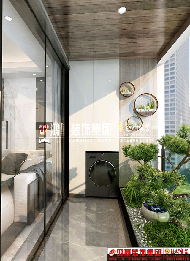 图4.亮点:阳台西侧滚筒洗衣机和储物柜的结合设计,充分利用空间。卫生打扫更加方便,不留死角。 东侧留有更多的空间可以培养绿植及休闲,给阳台空间增添生机。