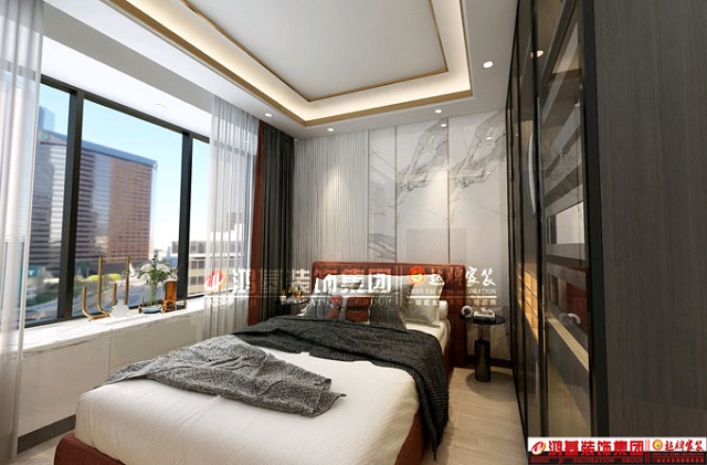 图5.亮点:为避免单调,主卧床头背景采用护墙板结合钛金条的设计,顶面吊顶相互呼应。