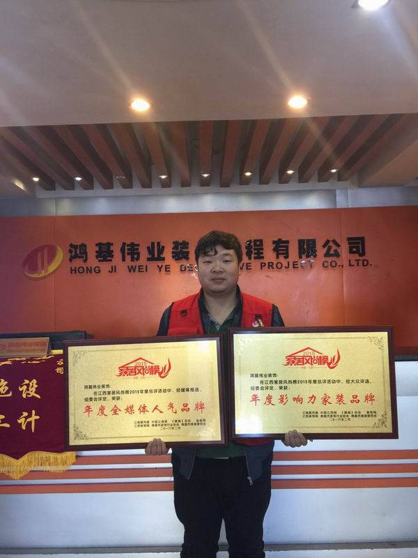 江西风尚榜2015年度总评活动中,经南昌市装饰行业协会、 南昌市家装委员会 、江南都市报、中国江西网 、 爱极网 、江西装饰网 、《赣商》杂志联合推选组委会评定,鸿基伟业装饰荣获 《年度影响力家装品牌》和《年度全媒体人气品牌》荣誉称号,南昌市东湖区人大代表、区工商联副主席、鸿基伟业装饰公司总经理胡克伟先生再次荣获《年度家居业优秀总经理》荣誉称号