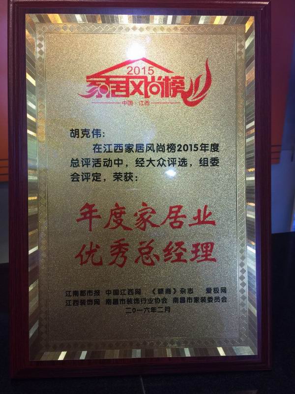 南昌市东湖区人大代表、区工商联副主席、鸿基伟业装饰公司总经理胡克伟先生再次荣获《年度家居业优秀总经理》荣誉称号