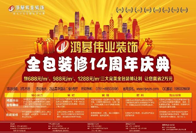 鸿基伟业装饰14周年感恩庆典钜惠活动将于3月26日(星期日)在红谷滩新区万达嘉华酒店盛大举行。让你最高直省2万元,活动前订单越早优惠越多。抢订热线:0791---88503995(红谷滩联泰7号广场总部), 网络报名:www.hjwyzs.com