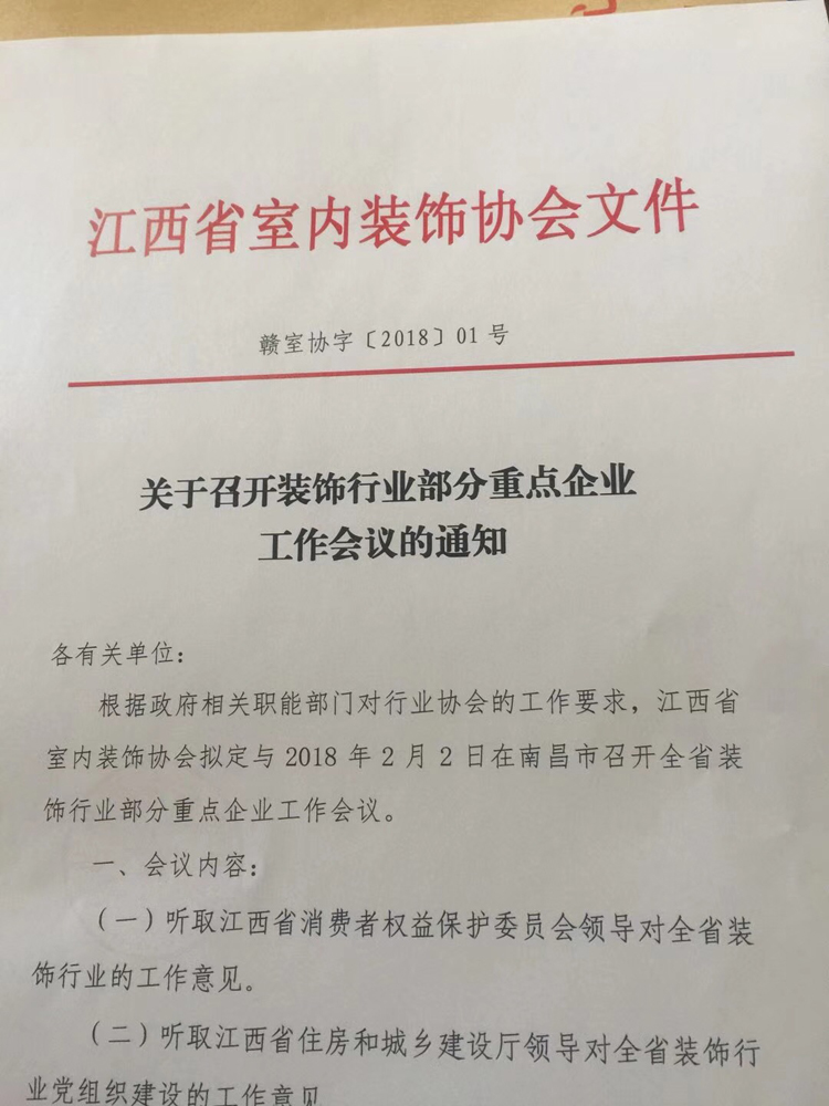2月2日上午,江西省室内装饰协会在南昌召开了由全省部分有影响的优秀装饰企业、设计机构、品牌材料商和知名大市场等代表参加的“2018年江西省室内装饰协会重点企业工作会议。”鸿基伟业装饰公司作为江西省室内装饰协会副会长单位,有幸被邀请参加了此次会议。