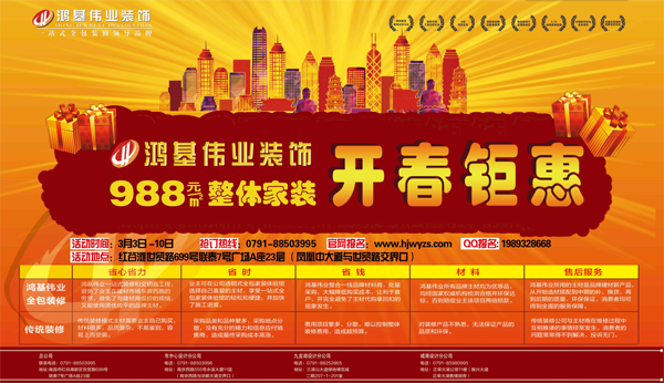 春暖花开,装修旺季也逐渐拉开了大幕。作为南昌装饰行业领军品牌企业、南昌本土全包装修领导品牌、南昌家装十强企业,鸿基伟业装饰公司将在3月3日至10日推出“988元每平方米整体家装,开春钜惠”活动,将引爆全城装修热潮。