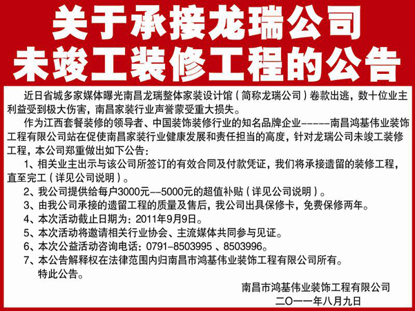 地址:南昌市红谷滩新区世贸路699号鸿基装饰集团A座23层(世贸路与凤凰中大道交界口)电话:0791- 88503995