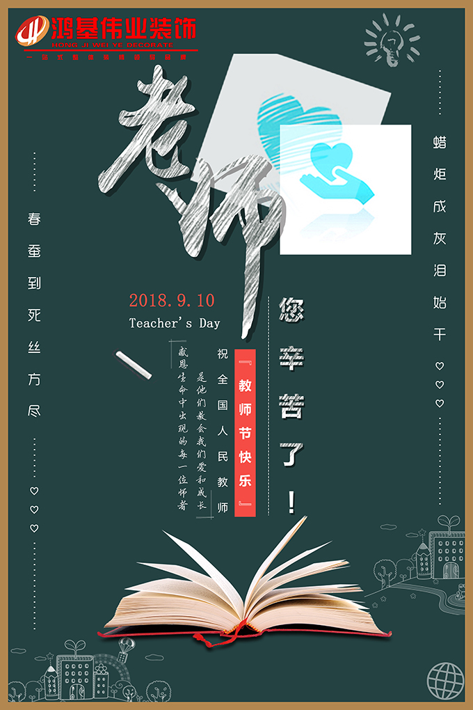 从迈进小学的兴奋无比到步入社会的忐忑不安,成长的道路上,老师的谆谆教诲与悉心照料伴我们走过了整个少年,我们由单纯简单的少年成长为今天自己,离不开老师们的辛劳,值此9月10日教师节之际,鸿基伟业装饰小伟祝愿广大的教师,节日快乐