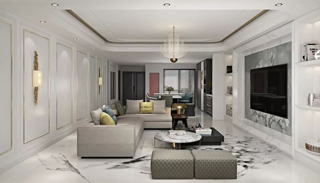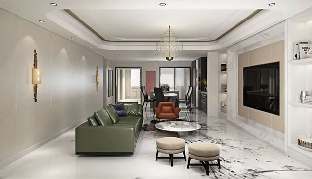 客厅以米白色系为基调,简约线条感的木饰面配以款式大方的家具,诠释出简洁、沉稳之感。