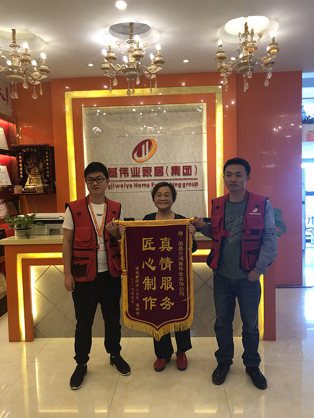 2019年5月21日,南昌鸿基伟业装饰公司的客户褚女士特地送来了一面写着“真情服务,匠心制作”的锦旗,对公司表示感谢。