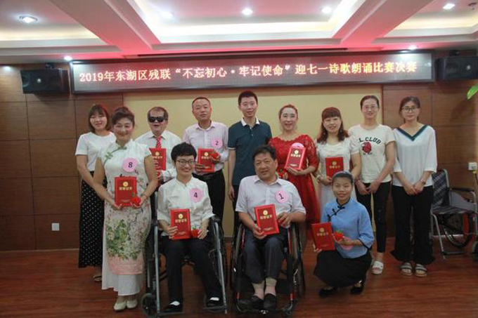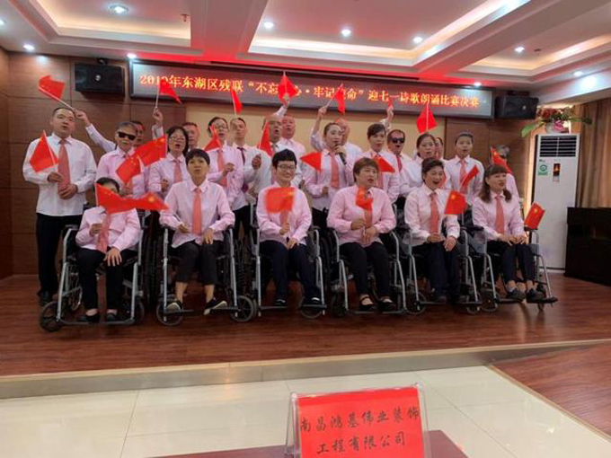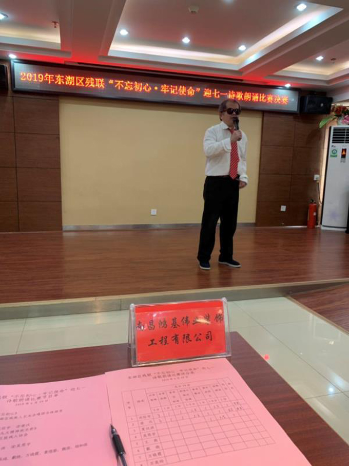 6月29日上午,南昌鸿基伟业装饰公司参加东湖区残联在残疾人之家举办的“不忘初心·牢记使命”迎七一诗歌朗诵比赛活动。
