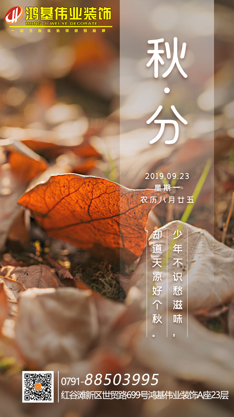 今天我们又迎来一个新的节气---秋分,按农历来讲,“立秋”是秋季的开始,到“霜降”为秋季终止,“秋分”正好是从立秋到霜降90天的一半。农谚说:“白露秋分夜,一夜冷一夜”,“一场秋雨一场寒,十场秋雨好穿棉”。养生专家提醒,随着秋分节气到来,冷空气开始日渐活跃,气温降低的速度明显加快,大家要准备好换季的秋装,以防着凉感冒。二十四节气这一天也送上鸿基伟业装饰公司全体员工的祝福: