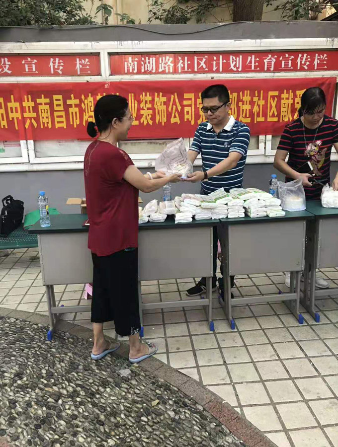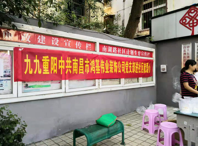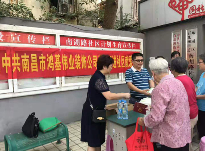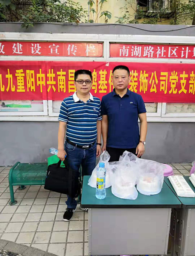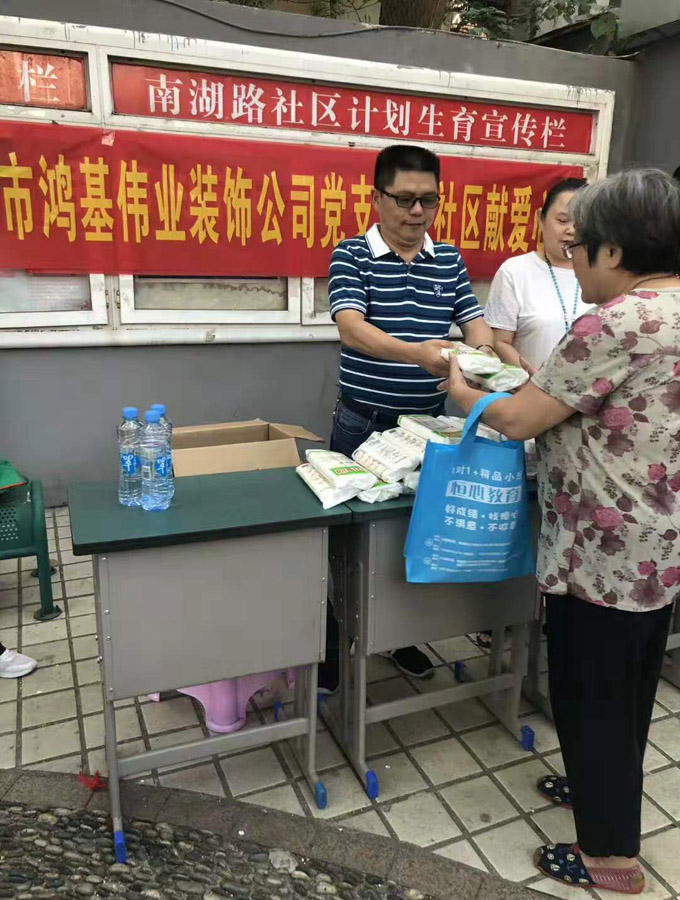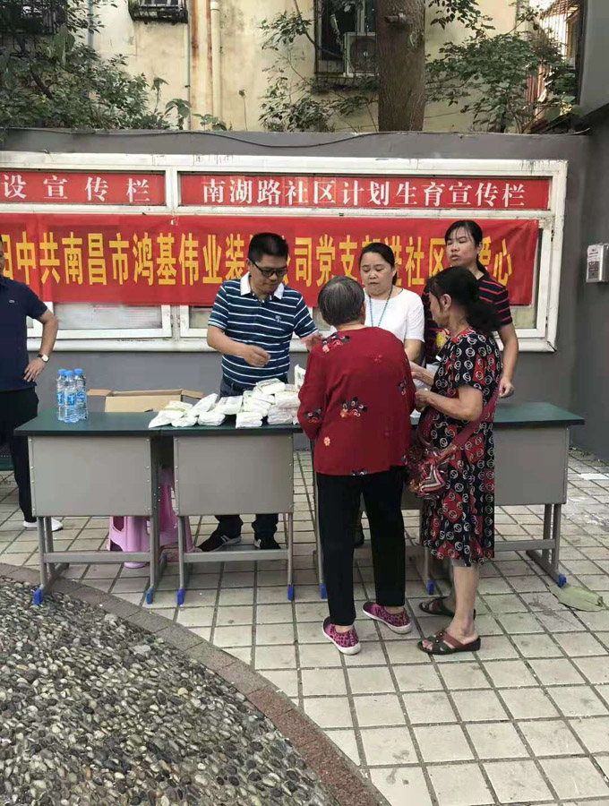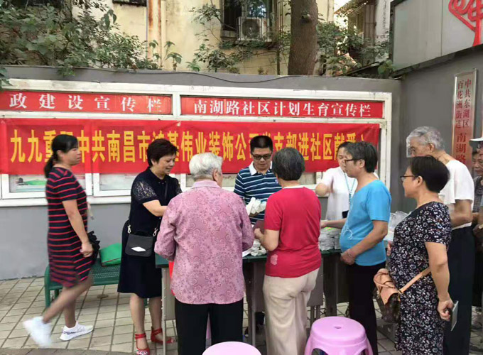 中共鸿基伟业装饰公司党支部联合南湖路社区党支部,连续五年在社区举行《九九重阳进社区献爱心》活动,以此表达中共鸿基伟业装饰公司党支部不忘初心,牢记使命,密切党群关系,为建国七十周年献礼!